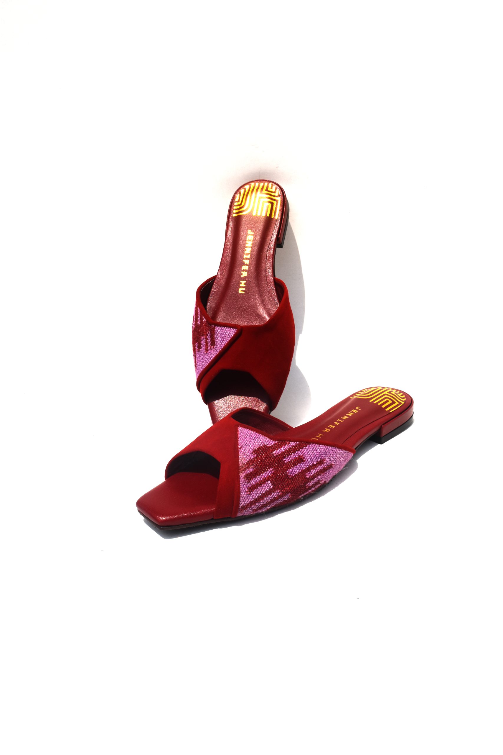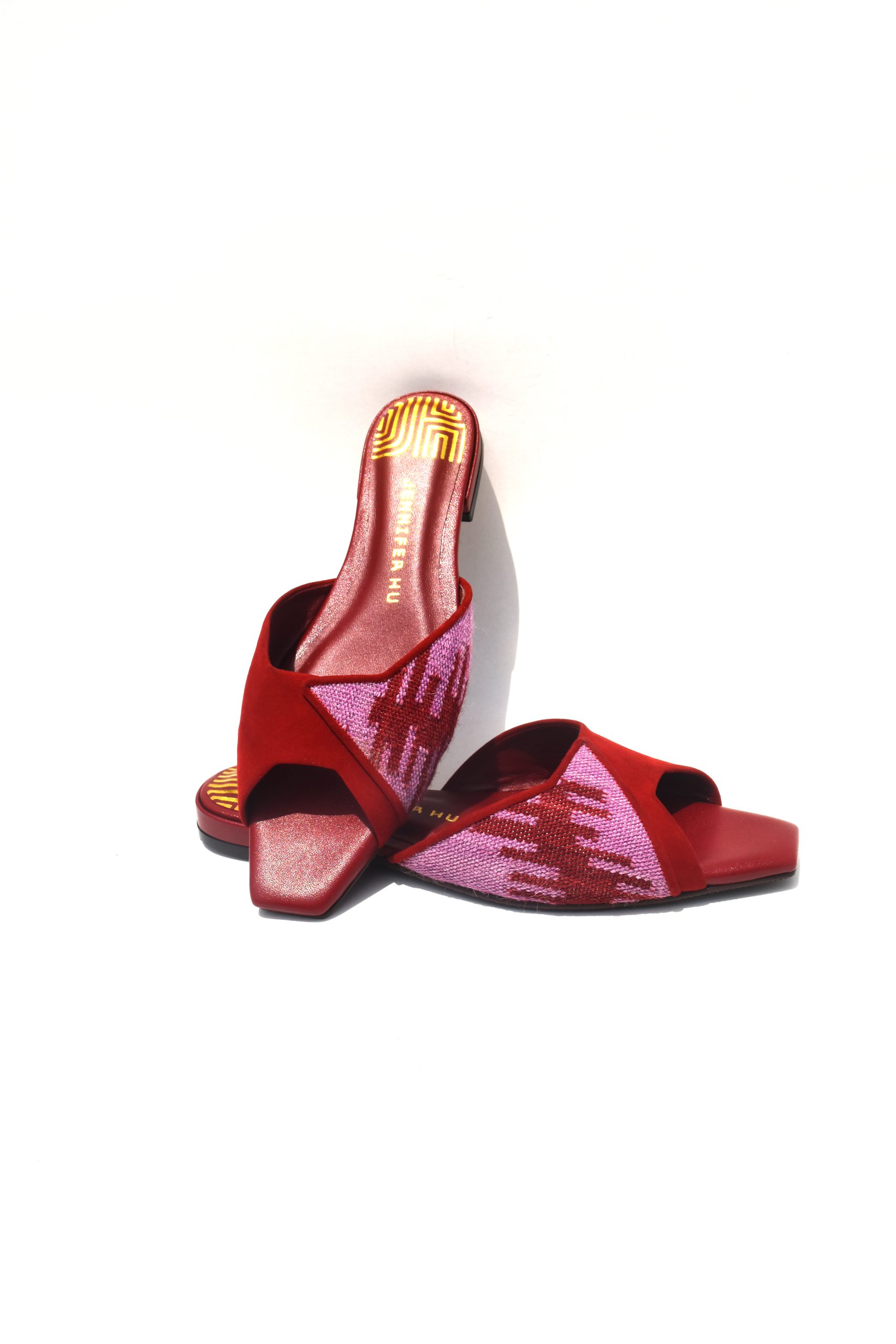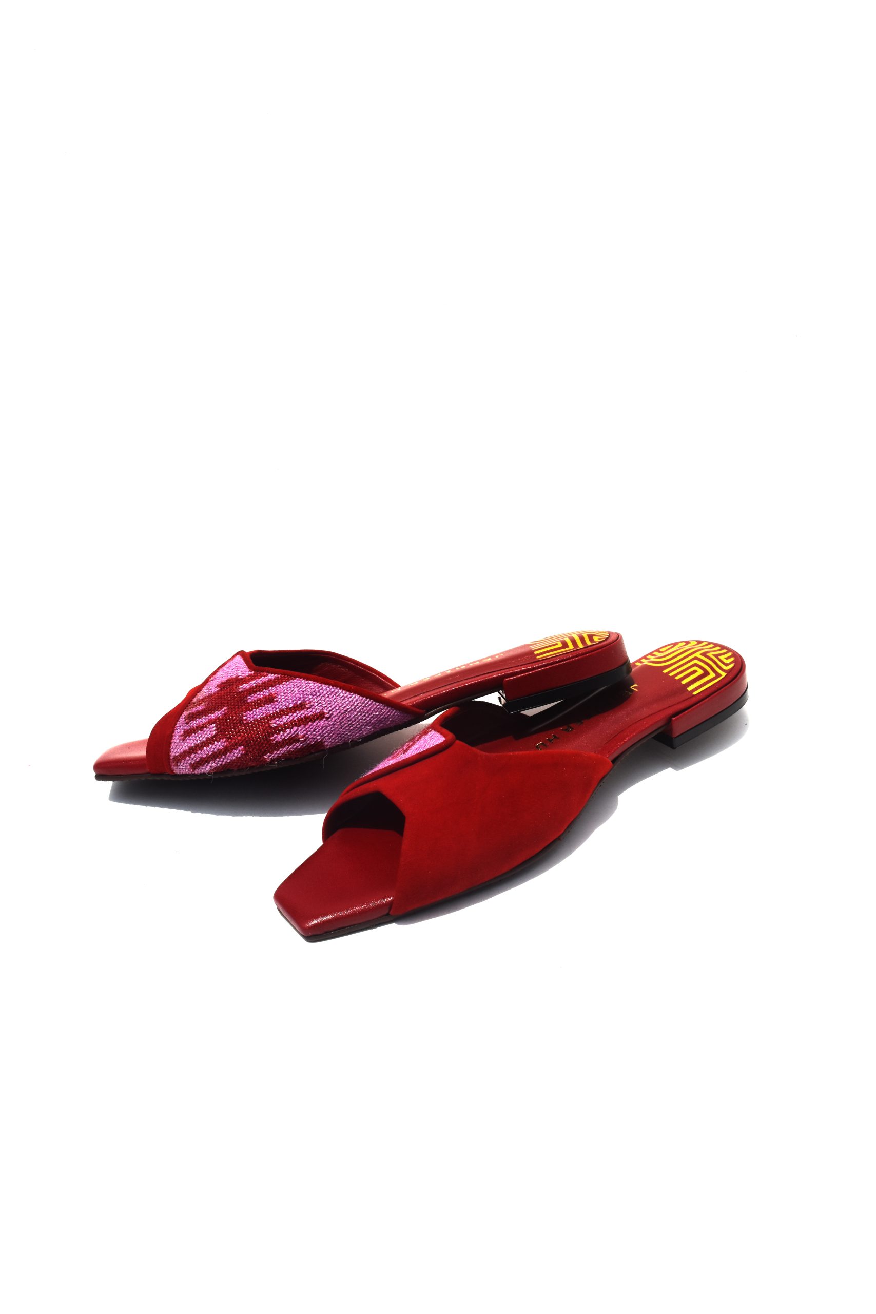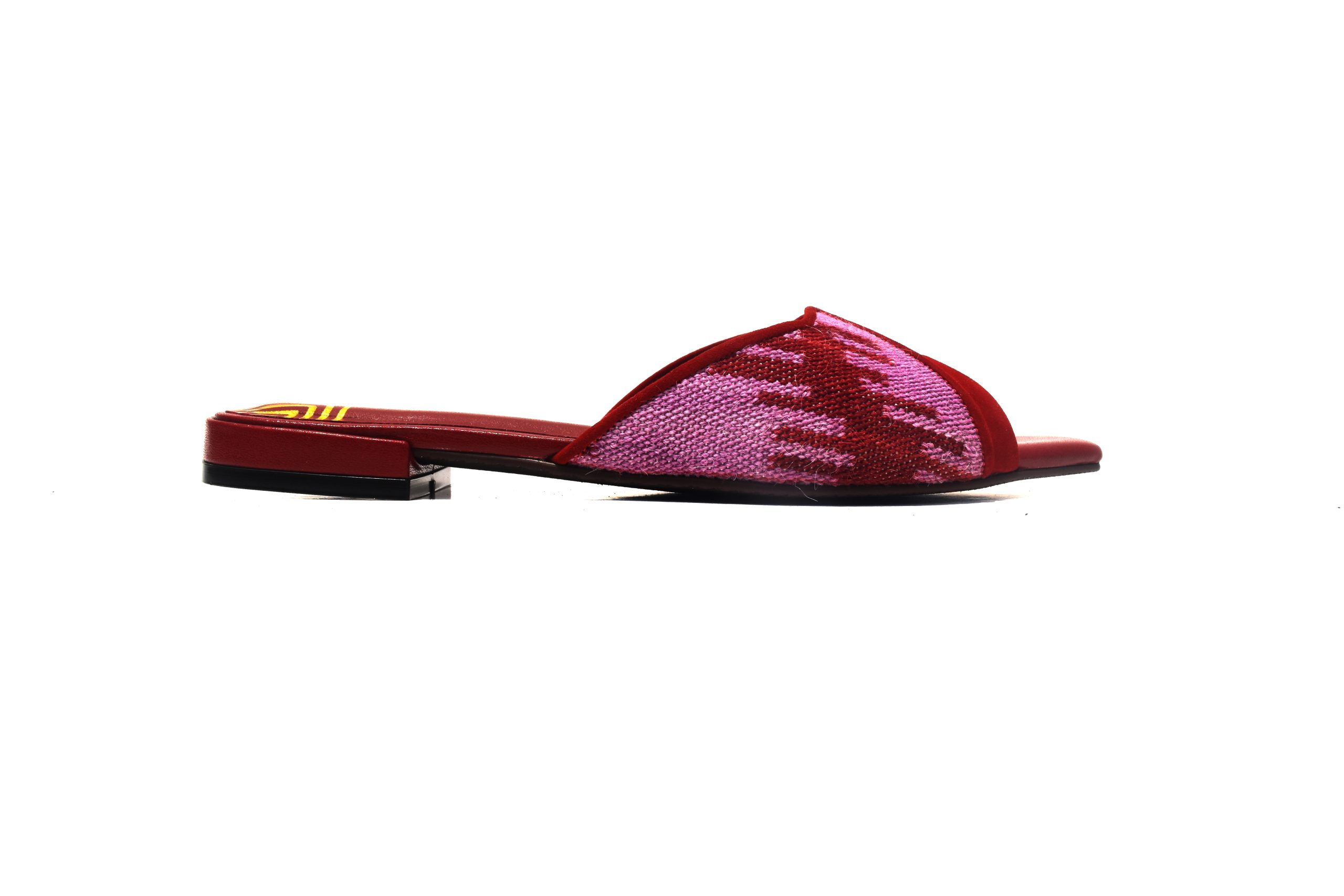 Upper: Red suede and red goatskin leather with handwoven alpaca textile (light purple & red)